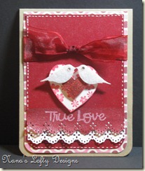 Hi! I am back again with another entry for the Paper Play Time Challenge. This is a standard size card cut at 4 1/4 x 5 1/2 on Bazzil kraft cardstock. This is a portrait style card. The first mat is a DSP that came from a pack from Sam’s Club cut at 4 x 5 1/4. The second mat is a deep red Bazzil cardstock cut at 3 3/4 x 5. The ribbon is from my stash. The heart stamp came from the dollar bend at Michaels and I stamp is with Jenni Bowlin Cough Syrup. The smaller heart is a 3/4 Marvy punch out of DCWV Christmas & Winter Glitter Matstack. The white birds are a Recollection embellishment from Michaels. I use the Martha Stewart eyelet lace border punch on the deep red Bazzil cardstock and Georgia-Pacific white cardstock. I punched the border twice for a layered affect. I use Perfect Pearls Mists Perfect Pearls to the front of the card. Enjoy! Come again. Hugs!